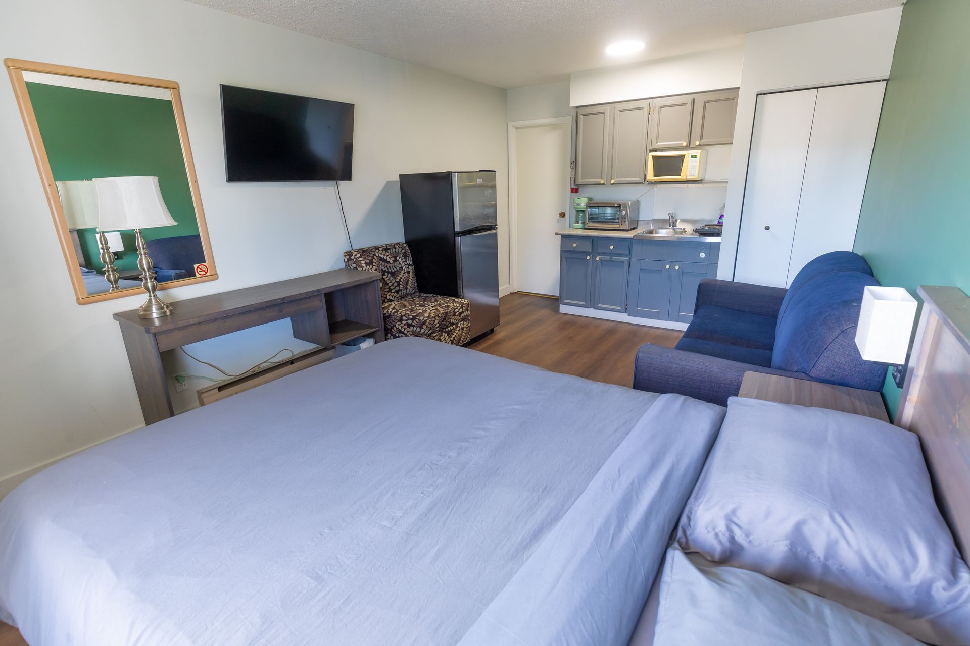 Choose from single queen rooms, double queens, or family suites, all with free Wi-Fi, air conditioning, Smart TVs, and kitchenettes for a stress-free stay.